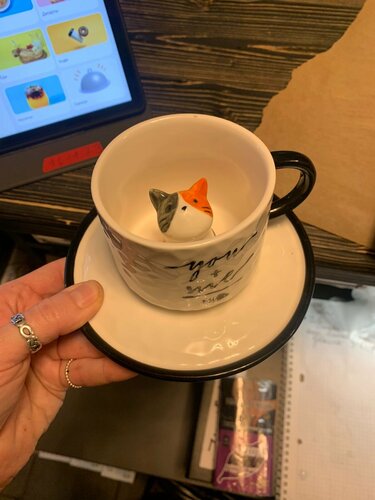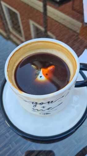 Очень уютная атмосфера, приветливый персонал, приятное музыкальное сопровождение, очаровательные тёплые кружечки с котиками